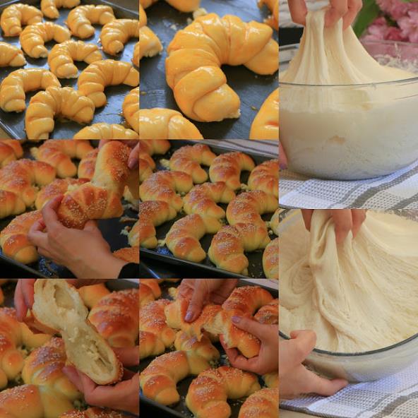 Podelite na manje komade, i napravite male loptice. Ostavite da odmore 10 minuta, razvaljajte oklagijom i punite. Umotajte kiflicu (vidite video), ostavite da narastu oko 1 sat, premažite umućenim jajima, susamom... Stavite da se peku na 200 stepeni dok ne porumene. Prijatno!