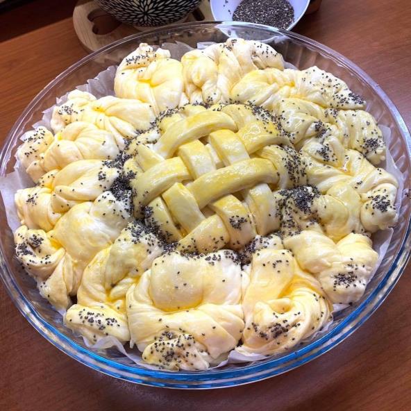 U toplo mleko staviti izmrvljen kvasac, kašičicu šećera, dve kašike brašna. Promešati i pustiti kvasac 5-10 minuta da se aktivira. Dodati jedno jaje, promešati pa dodati brašno. Umesiti glatko testo. Podeliti na 11 jufkica. Svaku premesiti. Jednu jufku staviti u centar posude za pečenje. Zatim dve jufkice iskoristiti za sečenje trakica. Trakice redjati preko centralne jufkice. Ostatak jufkica seći po sredini i praviti oblik lista. Redjati u krug. Premazati žumancem i po želji ukrasiti semenkama. Peći na 200 stepeni 30-35 minuta. Prijatno!