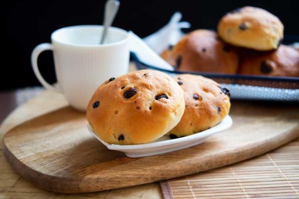 U toplo mleko sipajte kvasac, šećer, vanilin šećer i promešajte, zatim dodajte puter i brašno. Umesite testo. Razvaljajte testo na radnoj površini i podelite ga na 12 delova. U svaki deo stavite komadiće čokolade i razvaljajte u kuglu. Rasporedite u tepsiju, premažite smesom od žumanca i mleka, pa pospite rendanom čokoladom. Poklopite i ostavite da stoji 45 minuta. Pecite na 180°C 20 minuta.