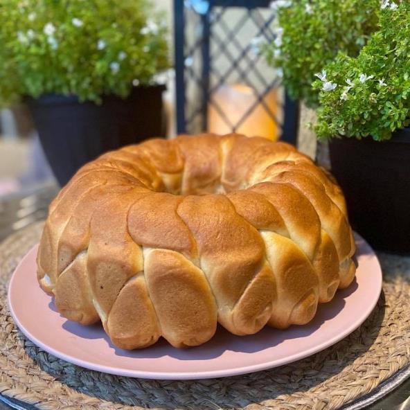 Aktivirajte kvasac. Zatim umesite glatko vazdušasto testo i ostavite da naraste. Razvucite testo i isecite na trake. Urolajte trake i ređajte uspravno po kalupu za kuglof. Pecite na 200°C 25-30 minuta.