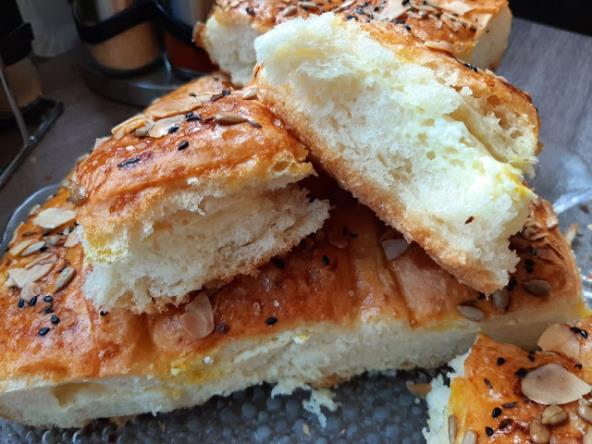 Rastopite kvasac u mlakom mleku, dodajte udrobljen kvasac i šećer. Ostavite da malo zapeni, pa dodajte mlaku vodu može i malo ulja i jedno jaje. Dodajte postepeno brašno, so i umesite srednje glatko testo. Pokrijte da naraste. Sto premažite uljem, pa istresite nadošlo testo i podelite na 2 dela. Prvi deo premažite uljem, kao i ruke i malo ga razvući rukama, a zatim oklagijom da se dobije što tanje providno testo. Premažite ga uljem malo. Na sredinu staviti manji tanjir pa nožem isecite 8 trouglova. Svaki trougao razvucite rukama i prebacite na sredinu. Ostavite da malo odmori u podmazanom plehu. Sa drugim delom isto tako uradite. Na prvi deo stavite sir koji ste pomešali sa jajetom. Preko njega drugi deo. Rukama pritisnite testo sa svih strana i širite u krug. Pustite da malo naraste, pa nožem isecite kvadrate. Premažite uljem i žumancetom, pa pospite kimom i krupnom solju. Pecite na 190°C oko 45 min. da lepo porumeni. Pokrijte krpom da se prohladi.