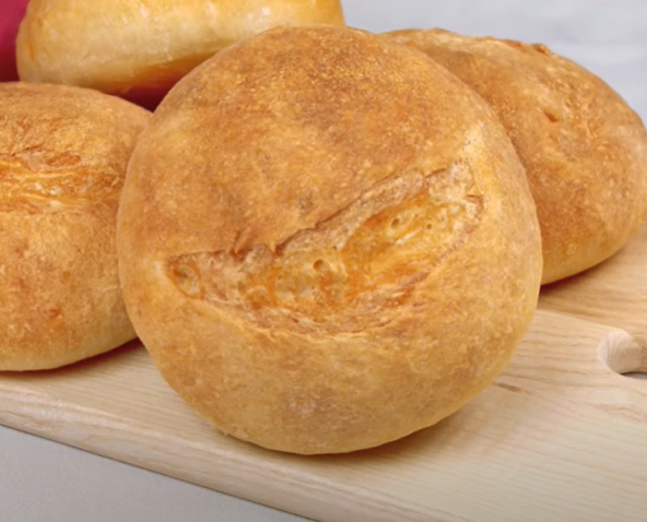 Odložite testo sat vremena, pa isecite na 4 dela. Ravaljajte testo u lepinje i ostavite da odstoji još 30 minuta. Zarežite nožem vrh svake lepinje, a zatim pecite na 220°C 35 minuta.