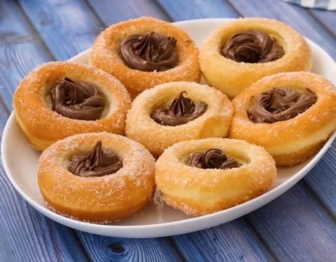 Pržite u dosta ulja. Gotovo pecivo uvaljajte u šećer, a u sredinu stavite namaz od lešnika (nutelu).