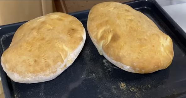 Prebacite testo na pobrašnjenu površinu i podelite na 2 dela. Premesite obe polovine i oblikujte u loptu. Rastanjite obe lopte rukama. Kad napravite željeni oblik, nauljenim rukama pređite preko njih, pa ih izbodite viljuškom. Izvadite pleh iz rerne, pa stavite pogače i vratite da se peku. Pecite nekih pola sata. Gotove vruće pogače umotajte u krpe i ostavite da odmore 10 minuta.