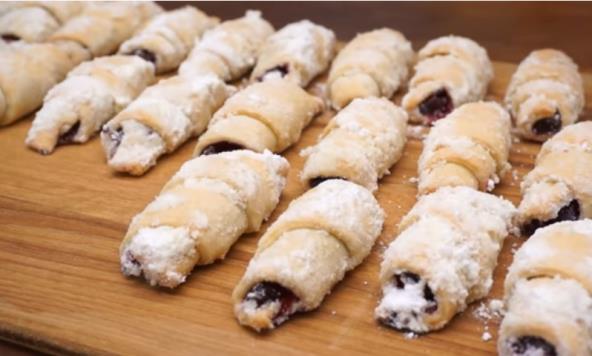 Isecite testo na 3 jednaka dela. Svaki deo testa razvaljajte u tanki krug i pospite ga sa malo brašna. Razvaljano testo treba da bude debljine približno 2-3 mm. Sva 3 kruga podelite na trouglove (treba da dobijete 12 trouglova). Stavite višnje na ivicu testa. Napravite kiflice.
