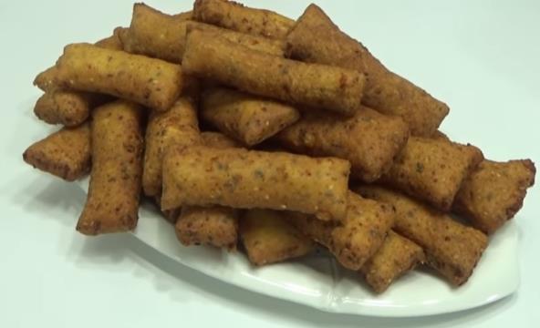 Umutite jaja, pa dodajte kiselo mleko, so, prašak za ulje i izmrvite sir. Lepo sjedinite. Dodajte lan i susam, i obe vrste brašna. Prvo kašikom promešajte, pa umesite testo rukama. Na pobrašnjenoj površini razvucite testo. Napravite štapiće i ubacite da se prži u zagrejanom ulju. Pogledajte VIDEO za detaljnu pripremu.