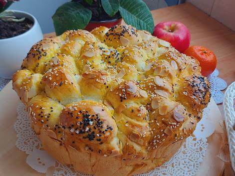 Redjati u okrugli pleh 28 cm prečnika koji ste podmazati uljem. Pogaču odmoriti pa je premazati sa žumancetom u koji ste stavili kašiku mleka i malo maslinovog ulja. Posuti susamom, i krupnom solju. Peći na 180 stepeni 50-60 minuta.