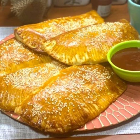 Kvasac aktivirati, zatim dodati sve sastojke i umesiti testo. Kada naraste razviti i seći oblike krugova. Krugove ispuniti nadevom i preklopiti. Zatvoriti ivice i viljuskom napraviti trake. Premazati žumancem i posuti susamom. Peći na 180 stepeni oko 20min. Prijatno!