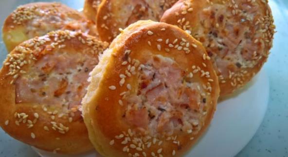 Manjom čašom napravite udubljenja u testu (ona koja ste stavili u pleh). Umutite 1 jaje i premažite obode peciva. Udubljenja punite pripremljenim filom. Pospite susamom po želji.