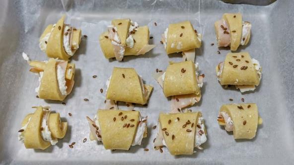 Secite u trougliće i uvijajte kiflice. Pospite susamom, lanom ili kimom i pecite na 220°C nekih 12-15 minuta.