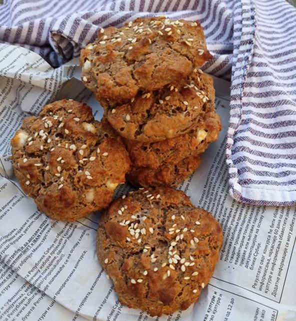 Žicom umutite jaja, pa dodajte ulje, jogurt, sir, brašno, prašak za pecivo i so. Izmešajte viljuškom da se sve lepo sjedini. Vadite kašikom na pek papir i pospite susamom.