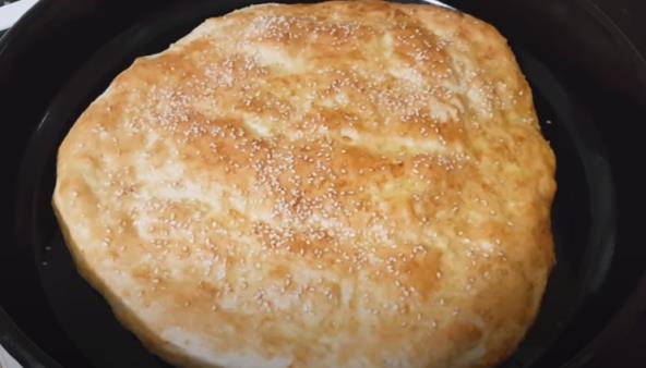 Kada je dovoljno naraslo istresite testo na pobrašnjenu površinu i podelite na 2 dela. Mesite, pa polako istanjite svaki lopticu koristeći ulje (ne oklagiju). Kada je dovoljno istanjite prstima formirajte udubljenja koja podsećaju na kockice (pogledajte video). Stavite testo u margarinom podmazanu tepsiju i ostavite da odmori oko pola sata (premažite pogaču jajetom i pospite susamom) dok se rerna zagreva na 200 stepeni. Kada je zagrejana pecite 15 minuta.
