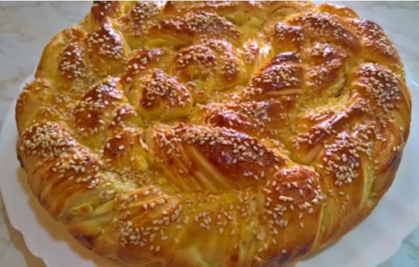 Pokrijte providnom folijom i ostavite 20 minuta. Žumance i pavlaku umutite, pa premažite pogaču. Pospite susamom i pecite na 200°C nekih 30 minuta.