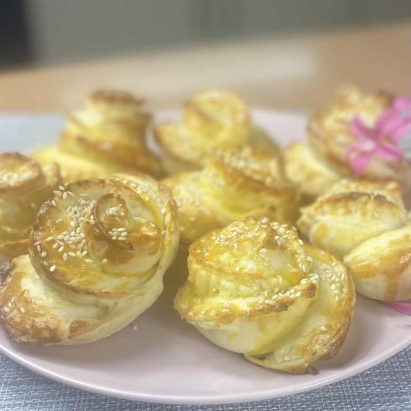 Testo umesiti, ostaviti da naraste. Praviti oblike, puniti sirom i redjati u pleh za pečenje. Ružice premazati žumancem i posuti susamom. Peći na 180 stepeni 20-25 minuta.