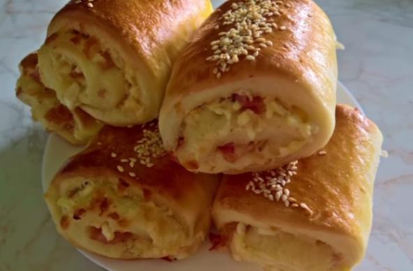 Prvi deo razvučenog testa premažite sa polovinom dobijene smese, pa sipajte preko secaknu šunku, rendani sir i kačakavlj, kao i origano. Urolajte i secite parčiće dužine otprilike 10 cm. Sa drugim razvučenim testom uradite isto. Poređajte u pleh obložen pek papirom. Premažite umućenim jajetom i pospite susamom.
