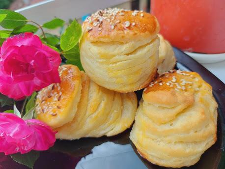 Testo razviti u pravougaonik pa premazati 1/4 smeše margarina i sira preklopiti sa jedne i druge strane ka sredini i onda još jedno jednu stranu. Pokriti da odmori 10 minuta. Tako još 3 puta. Razviti u pravougaonik cm debljine i vaditi čašom pogačice i ređati u tepsiju podmazanu, pokriti 10 min. pa premazati žumancetom i posuti susamom.
