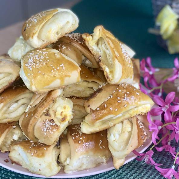 Izmrvite kvasac, pa dodajte šećer i toplo mleko. Promešajte i ostavite nekih 10 minuta, da se kvasac aktivira. Zatim dodajte toplu vodu, ulje, belanca, mleko, promešajte, pa dodajte pola količine brašna i so. Malo sjedinite, pa dodajte ostatak brašna (50 g ostavite sa strane). Umesite meko testo i pokrijte krpom, pa ostavite sa strane pola sata. Testo podelite na 4 dela i oblikujte loptice. Zatim pokrijte i ostavite da odmore 15 minuta. Maslac otopite i dodajte žumanca i promešajte. Ono brašno koje ste odvojili (50 g) pospite malo po radnoj površini i razvucite testo u obliku pravougaonika. Premažite sa maslacem stavite sir preko i urolajte. Tako uradite i sa preostala tri dela. Isecite parčiće i ređajte u pleh obložen pek papirom. Premažite umućenim žumancima i pospite susamom. Pecite na 180°C 25 minuta.