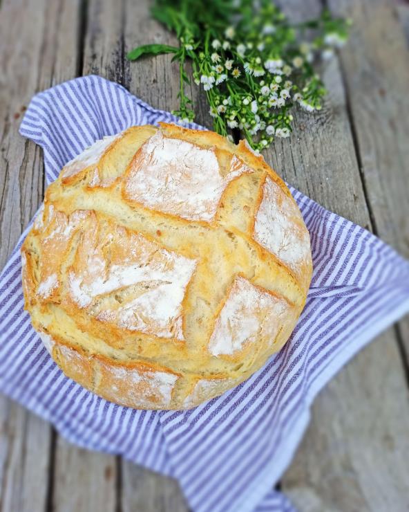 Razmutiti kvasac u mlakoj vodi sa kašikom brašna, kašičicom šećera i ostaviti da malo nadođe. Zatim u kvasac dodati ulje, so i brašno pa zamesiti mekano testo da se malo lepi za prste i ostaviti na toplom mestu da naraste 30 minuta. Pa opet premesiti i ostaviti još 30 minuta da narasta. Zatim izručiti na radnu površinu posutu brašnom oblikovati loptu i saviti u šerpu za pečenje obloženu pek papirom pokriti, pa ostavite da se odmara još 20 minuta. Pre pečenja posuti brašnom i napraviti nekoliko rezova nožem poklopiti poklopcem i staviti u zagrejanu rernu da se peče 30 minuta na 220 stepeni pa smanjiti na 200 stepeni i peći jos 15 minuta.Po potrebi otkriti da porumeni odgore.