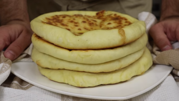 Testo podelite na 4 dela. Oblikujte loptice, pa svaku razvucite. Stavite kuglu smese sa mocarelom i obmotajte testo okolo. Razvucite svaku lopticu testa opet i pecite u tiganju. Premažite maslacem kad budu gotove.