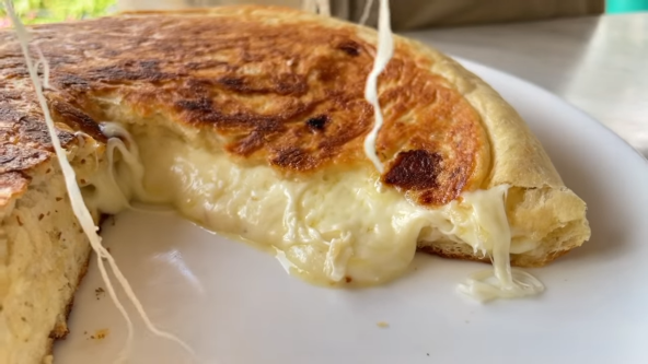 Brašno, suvi kvasac, šećer, so i vodu pomešajte i umesite testo. Zatim dobro nauljite testo i posudu i ostavite da stoji nekih sat i po vremena. Malo razvucite testo i onda stavite na sredinu rendani sir koji ste oblikovali u loptu. Obmotajte testo oko sira. Spljoštite testo i stavite u nauljen tiganj. Poklopite i ostavite pola sata. Pecite po 15 minuta sa obe strane na nižoj temperaturi, a okrenite uz pomoć nauljenog tanjira.