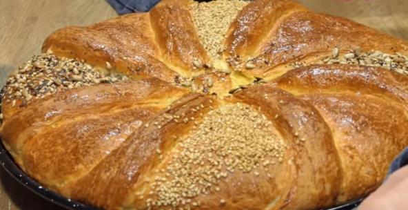 U prosejano brašno (pola količine) dodajte izdrobljen kvasac, šećer, jaje, mleko, jogurt, puter i na kraju so. Umutite mikserom testo, pa pokrijte i ostavite da odmori 30 minuta. Nakon tog vremena opet kratko umutite testo, sipajte preostalo brašno, pa ga prebacite na pobrašnjenu površinu. Špatulom nekoliko puta preklopite testo dosipajući malo brašna. Kada umesite testo odvojite mali deo koji će služiti za dekoraciju hleba. Pleh premažite puterom, pa stavite veći deo testa. Premažite i testo istopljenim puterom. Zatim od manjeg testa formirajte osam izduženih oblika (kao valjak) i lopticu. Lopticu stavite na sredinu, a okolo preostalo testo. Providnu foliju premažite puterom i pokrijte testo. Ostavite 40 minuta da odmori. Premažite preostalim umućenim jajetom. Šupljine pospite semenkama po želji. Pecite u zagrejanoj rerni na 180°C oko 50 minuta.