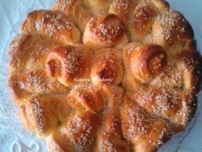 Kiflice redjati u krug, sirom stranom okrenutom prema spolja, a od isecenih traka oblikovati ruzice i smestiti ih u sredinu (pleh je precnika 32 cm, treba ga prethodno namazati margarinom ili obloziti papirom za pecenje). Kad smo sve fino rasporedili, pokriti testo i ostaviti da kiflice narastu dok ne ispune ceo pleh, oko sat vremena.