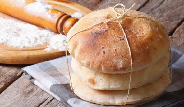 3. Za to vreme ugrejte tiganj prečnika oko 24 cm. Jednu kuglu testa razvaljajte i stavite je u vreo podmazan tiganj. Pecite dok se na površini ne pojave veliki mehurići. Okrenite i nekoliko minuta pecite i s druge strane. Pitu izravnajte lopaticom. Dok pečete pita-hlebove, već pečene čuvajte na toplom (uvijte ih u kuhinjsku krpu).