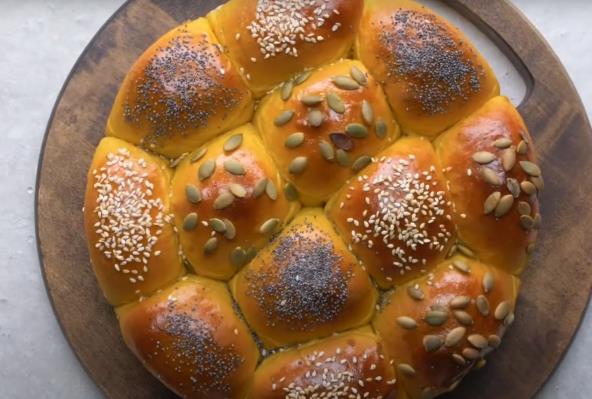 Kvasac izmrvite, pomešajte sa šećerom i polovinom toplog mleka, pa ostavite da se aktivira oko 10 minuta. Za to vreme pomešajte brašno sa praškom za pecivo i solju, pa potom dodajte ulje i preostalo mleko, a zatim i kvasac. Zamesite glatko testo. Pokrijte čistom krpom i ostavite da se udvostruči, oko sat vremena. Nakon toga ponovo premesite testo, pa ga podelite na 12 delova. Oblikujte manje lepinje, pa ih poređajte u okrugli lim za pečenje. Razmutite jaje, pa svaku lepinjicu premažite i pospite semenkama. Rernu zagrejte na 180 stepeni, pa pecite oko 40 minuta.