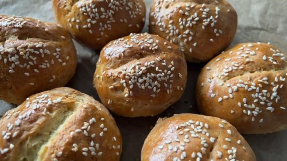 Prvo stavite suve sastojke u činiju, odnosno brašno, šećer, so i sodu. Mešajte kašikom dok se ne sjedini. Zatim dodajte jogurt i umesite testo varjačom ili rukom. Kada je testo formirano, kidajte komade testa i oblikujte lepinje. Stavite ih na pleh obložen papirom za pečenje. Koristeći nož, napravite lagane rezove na lepinji. Gornju površinu lepinje premažite umućenim jajetom i pospite susamom. Stavite lepinje u rernu zagrejanu na 200 stepeni i pecite ih 20 minuta. Nakon pečenja ostavite da se ohlade na rešetki.