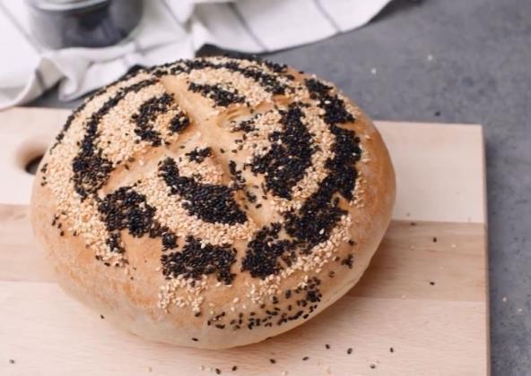 U činiji pomešajte toplu vodu sa šećerom i kvascem, pa dodajte maslinovo ulje, brašno i so. Testo podeliti na dva dela, utisnuti u susam koji ste rasporedili na tanjiru i ostaviti da naraste 40 minuta. Pecite na 200°C 30 minuta.