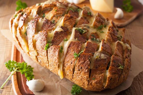 Za ovaj hleb u činiji pomešajte puter, peršun, maslinovo ulje i beli luk. Zagrejte rernu na 180 stepeni C. Isecite veknu dijagonalno, otprilike na svakih 6 cm, od vrha vekne do dna, bez presecanja do kraja. Ponovite na suprotnoj dijagonali da biste napravili delove u obliku kocke koji su još uvek pričvršćeni za donju koru.