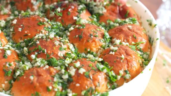 Iseckajte beli luk i začinsko bilje. Dodajte vodu i ulje. Podelite testo na 15 loptica. Rasporedite loptice u podmazan pleh. Pokrijte prozirnom folijom i ostavite da se dižu 15-20 minuta. Pecite 20-22 minuta u rerni zagrejanoj na 180°C. Vruć hleb premažite belim lukom i prekrite prozirnom folijom. Ostavite najmanje 10-20 minuta pa poslužite.