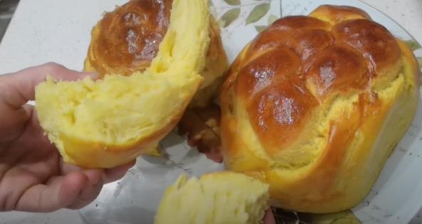 Kako biste napravili ovaj hleb, pomešajte suvi kvasac, toplo mleko i 3-4 kašike brašna. U istoj činiji umutite jaja i dodaje polovinu ulja, vanilin šečer i steviju. Prosejte brašno pomešano sa kurkumom. Nastavite da mesite dok ne dobijete meko testo i zatim dodajte ostatak ulja tako što ćete na radnoj površini testo odozgo da premažete uljem, pa ga preklopite tako da ulje ostane unutar pregiba, ponavljate mešenje. Nastavite na ovaj način da mesite testo, dok ne potrošite sve ulje.