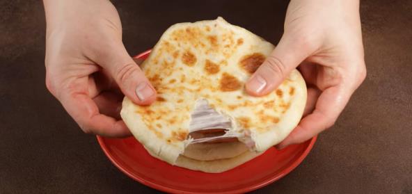 Pokrijte testo i ostavite da odstoji 15 minuta. Za fil, sitno narendajte 300 g mekog sira. Takođe, sitno iseckajte 200 grama šunke. Podelite testo na 8 delova i razvijte ih u kuglice. Držite testo pokriveno da se spreči sušenje. Svaki deo tanko razvucite u prečniku od 20 cm. U sredinu stavite fil od sira i šunke i lagano pritisnite ivice testa.