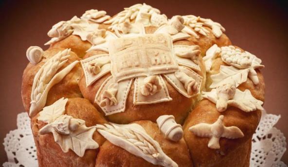 3. Ukrase za kolač napraviti od čvrstog testa napravljenog od brašna i vode. To testo treba tanko razvaljati oklagijom i iseći 5 slova (pomoću pečata Isus Hrist pobeđuje). Formirati još i goluba, grozd, klas pšenice i cvet.