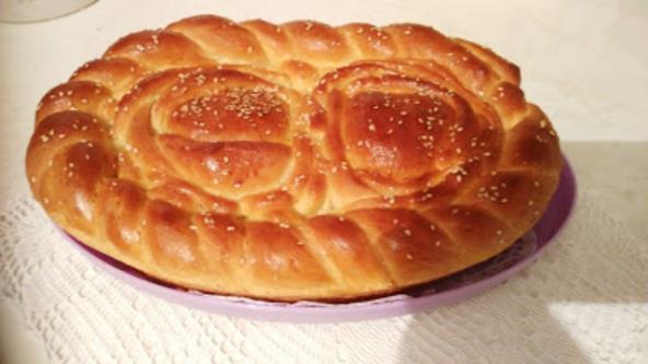 Naraslo testo premesiti i pustiti još jednom da naraste. Izvaditi testo na radnu površinu, dodati malo brašna ako se lepi. Odseći dve loptice od testa pa od svake napraviti dugački valjak. , a zatim ih uviti u pletenicu i staviti na ivice pleha, koji smo namazali uljem i pobrašnjivili. Zatim ponovo odseći dve loptice razviti u obliku malog tanjira pa u svaki staviti po kašičicu ml. i zasladjenih oraha saviti krajeve kao za buhtlu. Razviti još dve loptice kao manji tanjir preseći u obliku krsta stim što se ne seče do samog centra već se ostavi malo. U centar staviti lopticu sa orasima pa obavijati isečene stranice i praviti ružu. Tako uraditi sa još jednom, pa staviti u donji deo pleha. Uraditi još jednu takvu ružu. Zatim napraviti još jednu pletenicu pa je staviti na onu donju. Namazati žumancetom i posuti susamom. Kad malo naraste peći na 180 stepeni C 40 min.