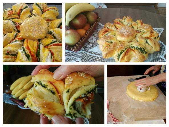 Testo podeliti na 4 jednaka dela, od sečenih delova napraviti lopticu za sredinu. Prvu lopticu razviti na peh papiru i namazati je sirom.