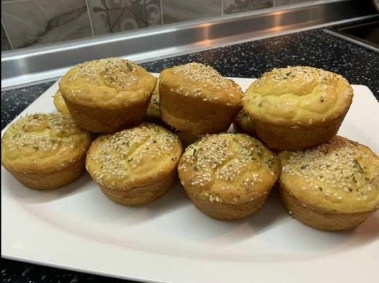 Jaja i so umutite, pa dodajte jogurt i ulje. Sjedinite mikserom, pa dodajte brašno i kukuruzno brašno. Sve promešajte i na kraju dodajte seckanu šunku i sir. Nauljite kalup za mafine i sipajte smesu unutra. Pospite susam i origano i pecite na 200°C nekih 25 minuta.