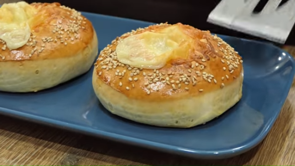 U toplo mleko dodajte jaja, kvasac, šećer, so, otopljeni puter i 450 g brašna. Dobro sjedinite i poklopite. Ostavite tako oko pola sata, pa dodajte preostalo brašno. Umesite testo. Dobijeno testo razvucite i kalupom napravite krugove. Svaki krug premažite umćenim žumancetom u koje ste dodali malo mleka. Stavite u pleh obložen pek papirom. Pritisnite svako testo u sredini da napravite udubljenje, pa stavite rendani sir. Oko udubljena pospite susam. Pecite u zagrejanoj rerni na 180°C oko 35 minuta.
