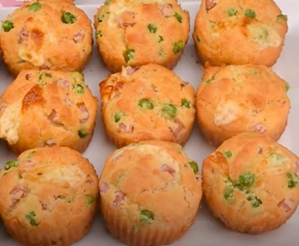 Pomešajte brašno, parmezan, prašak za pecivo i so. Tu dodajte grašak i šunku pa sve sjedinite. U drugoj posudi umutite jaja, mleko i ulje. Pomešajte obe smese i sipajte u kalup za mafine. U sredinu mafina stavite po kockicu sira. Pecite na 180°C 20 minuta.