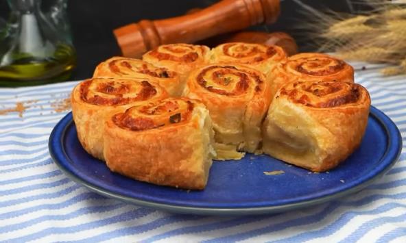Lisnato testo premažite krem sirom. Pospite rendanom šunkom i rendanim kačkavaljem pa dodajte odozgo i seckan luk. Uvijte u rolat i isecite na manje parčiće. Njih poređajte u okruglu vatrostalnu posudu (možete i u četvrtastu) sa ravnom stranom okrenutom ka gore i ka dole. premažite umućenim jajetom. Peći u rerni na 190 °C 30 minuta.