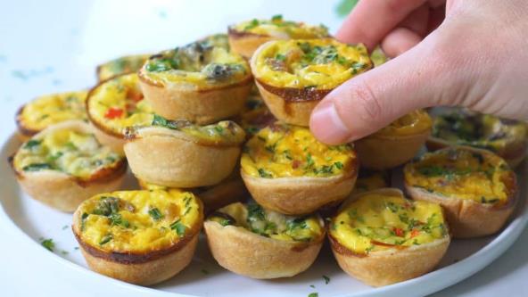 Razvucite lisnato testo, pa okruglim kalupom vadite oblike. Utisnite testo u kalup za mafine tako da pokrije i ivicu. Stavite u svaki mafin malo slanine, pečuraka i paprika, pa pospite sirom. Preko sipajte nadev od jaja. Kašikom promešajte sve sastojke.