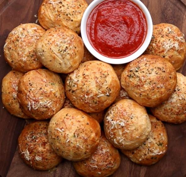 Pomešajte rastopljeni puter, beli luk, so, biber i origano u maloj posudi. Nanesite mešavinu putera na svaku kuglicu i posipajte parmezanom. Pecite 15-20 minuta, dok bombice lepo ne porumene. Kada se dovoljno ohlade servirajte i uživajte u pica bombama!