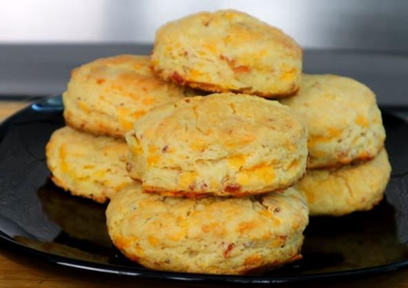U posudi pomešajte brašno, prašak za pecivo, sodu bikarbonu, so i šećer. Sve lepo promešajte, pa dodajte rendani ledeni puter i dobro sjedinite. Zatim dodajte rendani čedar sir sa proprženom i seckanom slaninom. Sve promešajte.