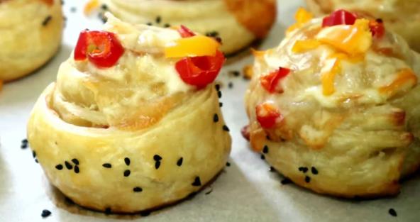 Odmrznite lisnato testo, pa ga malo razvucite oklagijom. Isecite na trake, pa na svaku traku stavite parče slanine i preklopite. Viršle skuvajte i isecite na parčiće. Zatim stavite jedno parče na lisnato testo i urolajte. Probodite čačkalicom da se testo ne odvoji. Poređajte na pleh obložen pek papirom, premažite umućenim jajetom, pa stavite parče sira i pospite susamom. Na vrh stavite malo secakne paprike, pa pecite u zagrejanoj rerni na 210°C oko 15-20 minuta.