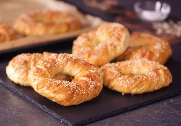 U posudi pomešajte kvasac, toplu vodu i šećer. Lepo promešajte, pa ostavite da se kvasac aktivira nekih 10 minuta. Zatim dodajte prosejano brašno i so, toplo mleko, jaje i istopljen puter. Umesite testo, stavite u nauljenu posudu i pokrijte provdinom folijom. Ostavite da nadođe nekih sat vremena na toplom mestu. Prebacite testo na pobrašnjenu površinu i razvucite u pravougaonik dimenzija 40x30 cm. Dve trećine testa premažite sa 30 g putera sobne temeprature. Preko pospite 50 g rendanog čedar sira. Preasvijte prvo čistu stranu testa do sredine, pa preklopite drugom stranom testa. Razvucite, pa premažite preostalim puterom isto 2/3 testa i pospite preostalim rednanim sirom. Ponovo preklopite testo na isti način, prvo čistim delom do sredine, pa preklopite drugom stranom testa. Ponovo razvucite, pa isecite na 8 traka. Svaku traku uvijte i spojite krajeve tako da dobijete krug sa šupljinom na sredini. Poređajte na pleh obložen pek papirom, pa pokrijte krpom i ostavite da nadođu nekih pola sata. Premažite umućenim jajetom i pospite solju i susamom. Pecite u zagrejanoj rerni na 200°C oko 20 minuta.