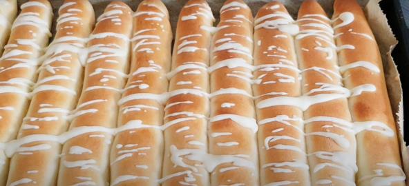 Prebacite testo na lagano pobrašnjenu površinu i razvaljajte ga u u oblik pice, na debljinu od 2-3 prsta. Isecite na 10-14 komada. Svaki komad razvaljajte u štapić. Prebacite štapiće na nauljenu tepsiju. Ostavite 30 minuta.