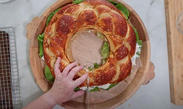 Oblikujte svaki deo u dugački trupac, a zatim ispletite trupce. Pripremite pleh sa papirom za pečenje, a zatim na njega stavite pletenicu i savijte je u veliki krug. Stavite posudu u sredinu, tako da zadrži okrugli središnji oblik tokom dizanja i pečenja.