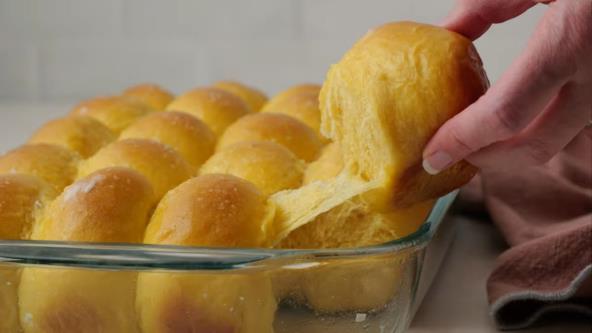 Kada testo naraste, istisnite vazduh i podelite ga na 20 jednakih delova (svaki oko 65–75 g). Oblikujte u loptice i poređajte ih u podmazan pleh dimenzija 23x33 cm (ili sličan). Pokrijte rolnice i ostavite još 30–45 minuta da narastu i postanu pufnaste.