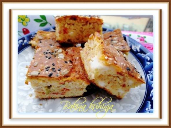 Umutiti jaja, dodati brašno jedno i dugo prosejano sa praškom za pecivo, jogurt, sir, seckane krastavčiće i papriku, ulje i sve dobro umešati.